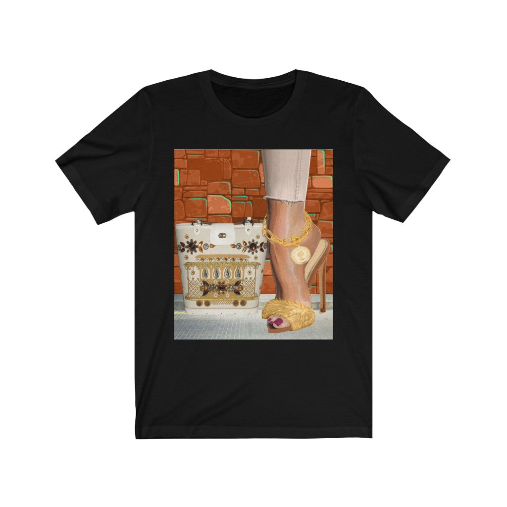 We sure do love a good high heel. Featuring a gorgeous foot with a stunning yellow high heel on and a matching bag printed on it, this T-shirt adds a bold, experimentative look to your outfit.